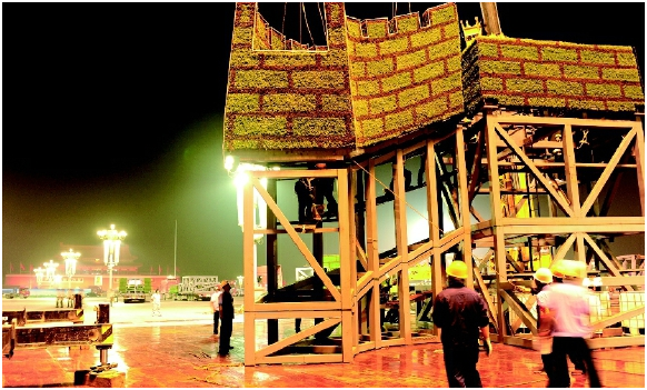 在景觀花壇的運輸及安裝過程中,為確保按時限要求,在8月11日夜間順利完成鋼結(jié)構(gòu)件的轉(zhuǎn)場作業(yè),首建集團精心準備,先后進行了三次線路勘察,并把車輛高度嚴格控制在4.65米范圍內(nèi),確保符合沿途路橋的通過極限要求。8月11日晚8點半,滿載著景觀花壇鋼結(jié)構(gòu)構(gòu)件的十四輛大型拖車從西集出發(fā),經(jīng)過近4個小時的行程,平穩(wěn)地陸續(xù)駛?cè)胩彀查T廣場內(nèi)的指定位置,在專業(yè)人員的引導(dǎo)下,進入鋪設(shè)好竹膠板和枕木墊塊的花壇擺放核心區(qū)域。隨后,在清脆的指揮哨音中,操作人員按照事先預(yù)定的施工方案,分頭完成構(gòu)件掛鉤、調(diào)整構(gòu)件姿態(tài)、找構(gòu)件碼放位置、解鉤等一系列動作。8月12日0點54分,第一鉤花壇底座平穩(wěn)落地。到早晨6點50分,這組花壇19塊鋼結(jié)構(gòu)中最后的兩塊被平穩(wěn)地吊裝到位,順利完工。