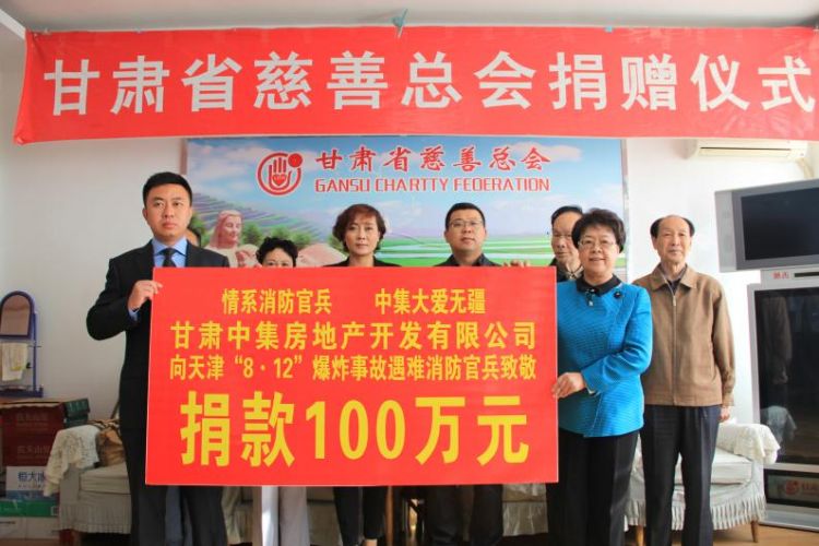 2015年8月12日23時(shí)30分,天津?yàn)I海新區(qū)國(guó)際物流中心發(fā)生重大爆炸火災(zāi)事故,造成重大人員傷亡。甘肅中集房地產(chǎn)開(kāi)發(fā)有限公司總經(jīng)理周啟濤獲悉后,決定為在本次事故中犧牲的消防官兵及其家屬捐款100萬(wàn)元,用于幫助犧牲消防官兵家屬善后事宜的處理,以盡一份甘肅企業(yè)的慈善愛(ài)心。