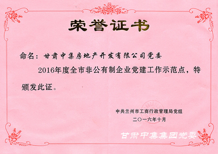 2017年10月10日,由蘭州市工商行政管理局評選的2016年度全市非公有制企業(yè)“黨建工作示范點”面向全市發(fā)布,甘肅中集房地產(chǎn)開發(fā)有限公司黨支部喜獲全市非公有制企業(yè)“黨建工作示范點”殊榮并獲得由蘭州市非公委補貼黨建專項經(jīng)費20000元。