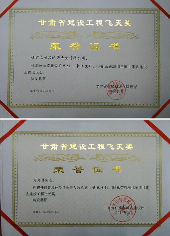 2016年2月5日,由甘肅省住房和城鄉(xiāng)建設(shè)廳評選的2015年度甘肅省建設(shè)工程“飛天獎”對社會各界發(fā)布,本次共發(fā)布41個“飛天獎”項目。其中,由甘肅中集實業(yè)集團(tuán)子公司甘肅蘭怡房地產(chǎn)開發(fā)有限公司開發(fā)建設(shè)的中集·幸福里憑借高品質(zhì)的開發(fā)標(biāo)準(zhǔn),喜獲甘肅省2015年度建設(shè)工程“飛天獎”榮譽稱號,成為蘭州市安寧區(qū)唯一獲此殊榮的項目。