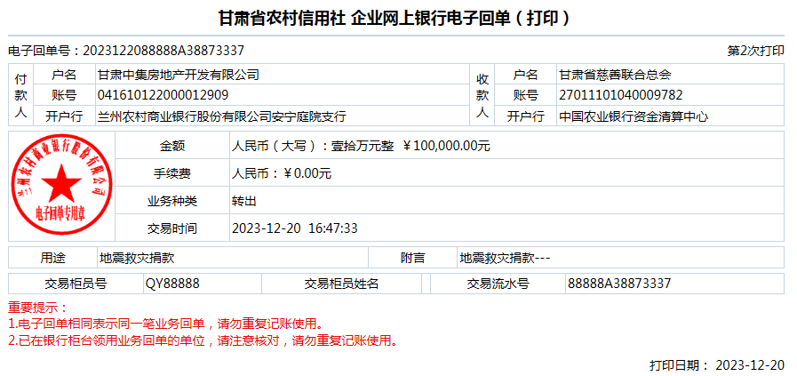 甘肅中集集團向臨夏積石山地震災(zāi)區(qū)捐款10萬元
